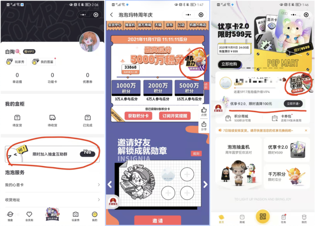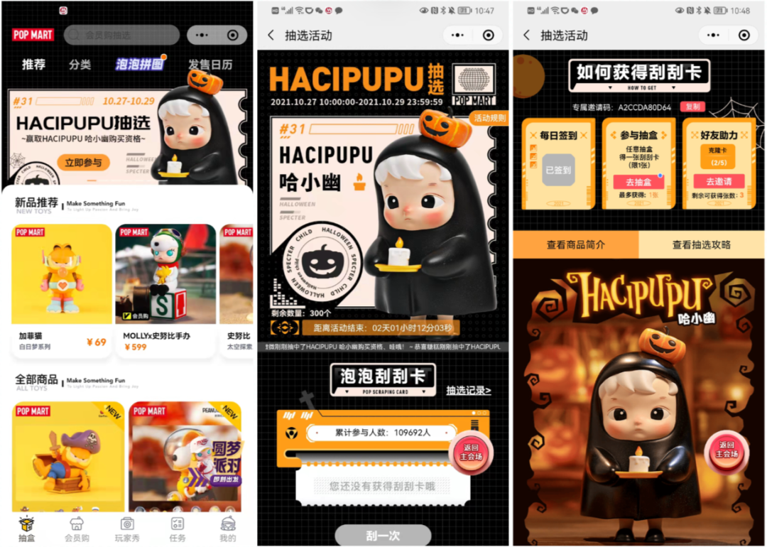活动详情:通过每日签到、参与抽盒、好友助力三种方式可以获得泡泡刮刮卡,刮刮卡可以开出购买资格,成功开出的概率为0.1%。每邀请成功5位好友助力可多一张刮刮卡,最多获得三张,即最多可以邀请15位好友助力。