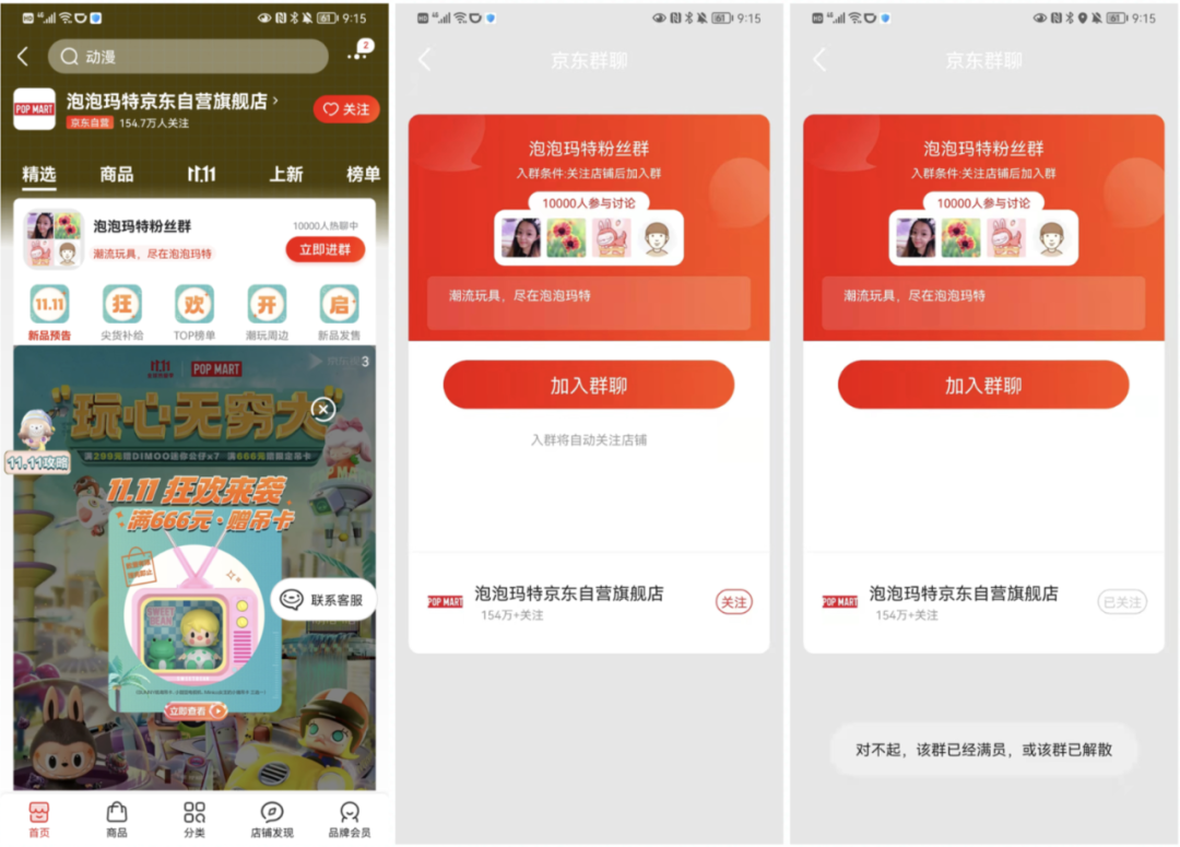 进入京东店铺首页即有明确的指令banner引导进群,进群条件为关注店铺,但是店铺已经满10000人无法进入。