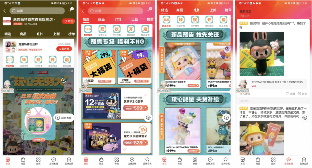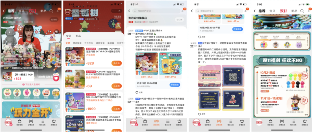 除会员体系和店铺上新外,天猫旗舰店每天直播卖盲盒、在动态内进行日常运营(如:买家秀赢盲盒活动)、配合天猫官方的整体活动来进行促销(如双十一活动)。