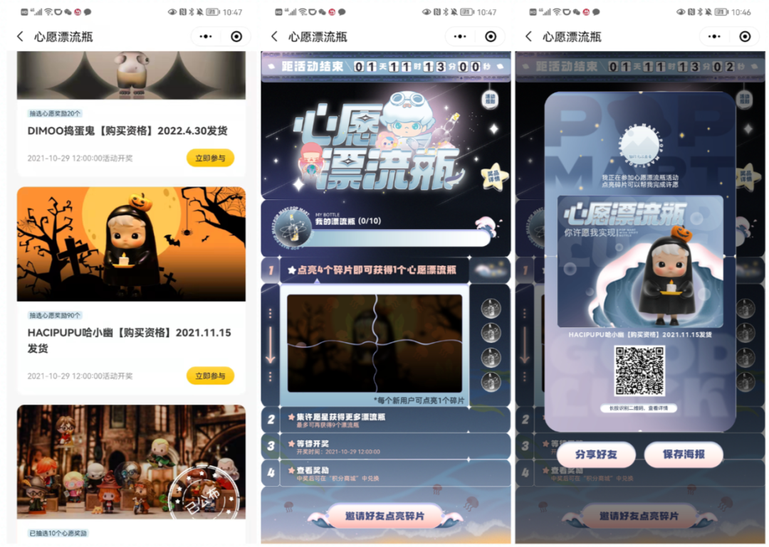 同样是针对HACIPUPU哈小幽的活动,通过邀请好友点亮碎片或者获取心愿星的方式获得心愿漂流瓶,集齐10个心愿漂流瓶后可以参与抽奖拿到HACIPUPU哈小幽『购买资格』。其中,每邀请一位“新用户会员”才能获取碎片,点亮四个碎片可获得一个心愿漂流瓶,邀请老用户会员只能获取心愿星(心愿星达到40个才能获取一个心愿漂流瓶),邀请新用户的同时也会掉落心愿星。总结:成功参与抽奖HACIPUPU哈小幽『购买资格』必须邀请40个新用户会员,老用户则更多。