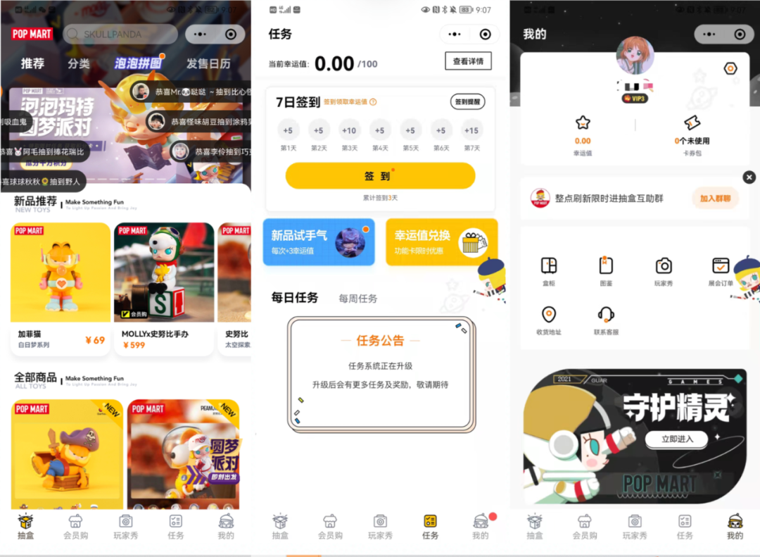会员福利&特权:不同等级会员会有不同的抽盒机提示卡&显示卡、积分兑换、免邮福利、玩具屋&展会&商城特权等。
