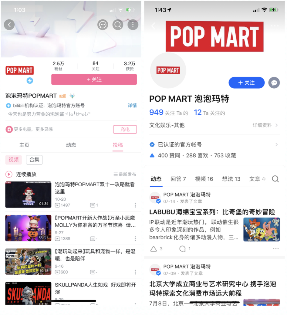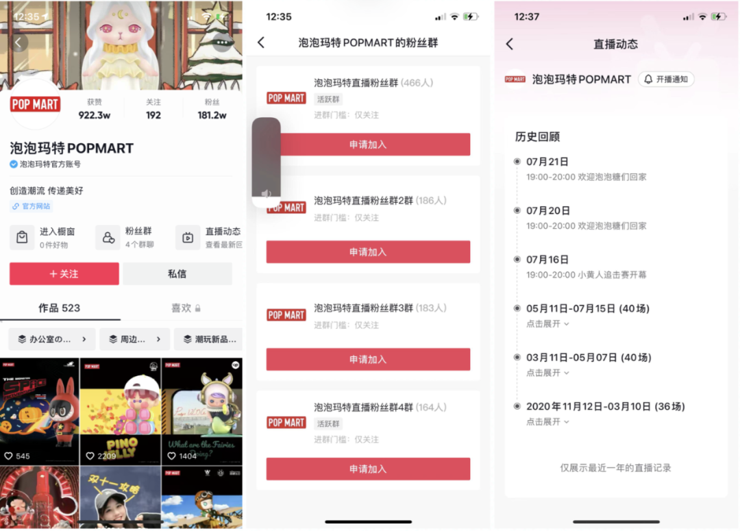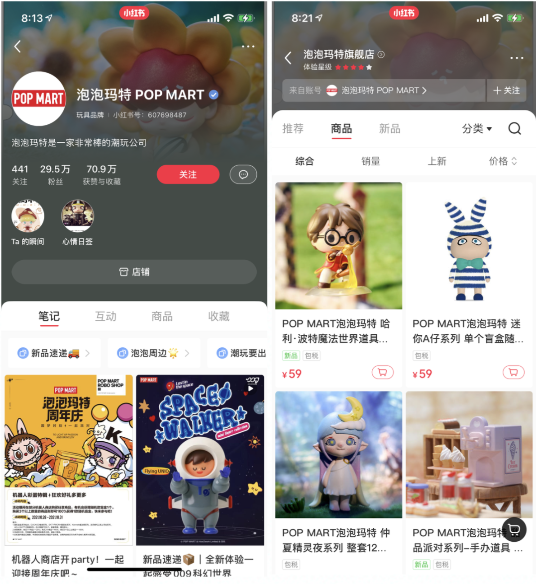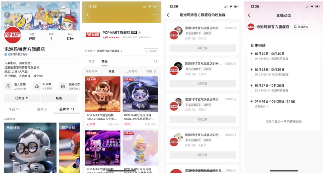 抖音平台一共有两个官方账号,分别为泡泡玛特POPMART,粉丝181.2w;泡泡玛特官方旗舰店,粉丝5.3w。泡泡玛特POPMART账户主要做内容和涨粉,泡泡玛特旗舰店开通了抖音小店,从10月10日至今直播13场,直播频率在两天一次至一天一次,预计13场直播销售额46.5w。