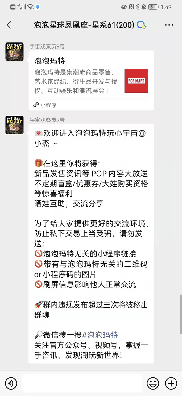 在泡泡玛特小程序内有多个进群入口,用户可以直接通过页面指导,加入企业微信粉丝群。