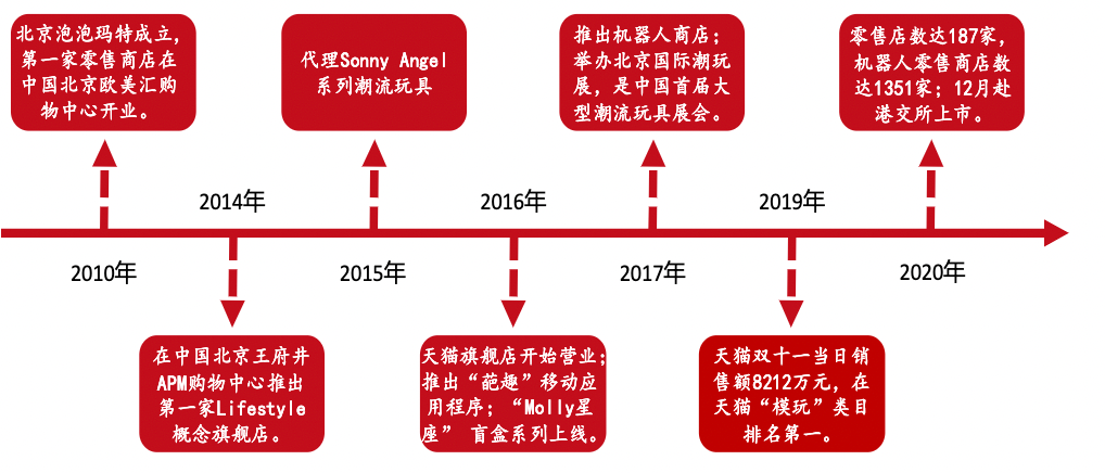 公司成立于2010年,发展初期定位于潮玩文具杂物零售商,第一家泡泡玛特门店在北京欧美汇购物中心开业。2015年创始人王宁从代理的日本盲盒IP Sonny Angel的畅销中获得灵感,次年与Molly创作者王信明签约合作,推出首款盲盒玩具“Molly星座系列”,公司正式由渠道商转型做IP孵化和运营商。2017年至今打通潮玩全产业链。目前公司围绕艺术家挖掘、IP孵化运营、消费者触达以及潮玩文化推广四个领域,构建了覆盖潮玩全产业链的综合运营平台。截至2020H1,公司拥有93个IP,其中自主和独家代理IP数合计37个;线下渠道布局方面,截至2020年底零售店数量达到187家,机器人商店数量增至1351家。
