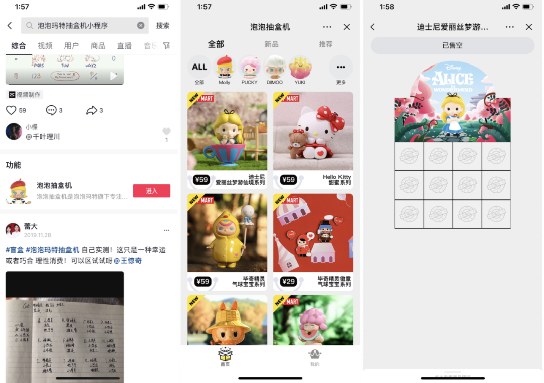 泡泡抽盒机:泡泡抽盒机尽力还原了在线下抽盒的过程,从找盒/选盒排队、点盒、摇盒、判断是不是心仪盲盒、选定、付款等一系列动作,增加了线上买盒的乐趣,使得用户可以随时随地抽盒。每次摇盲盒都有三次提示告诉你该盲盒不是哪一款,从而在一定程度上排除了1/4的盲盒,减少了一定的盲目感但又把盲盒的神秘感拿捏的很好。传统电商渠道只有盲盒快递到手你才能知道抽到了什么,而在线上抽盒机,选定盲盒付款后会直接“拆盲盒”,如果不是你想要的款,“再来一次”的想法则会让用户很快产生复购行为。根据弗若斯特沙利文调查 ,70%的用户 会为了自己心仪的特定款式的购买盲盒玩具超过3次以上。并且,3个盲盒包邮发货的设定也能让用户为了“凑单”而产生复购行为。同时,抽盒机特有的显示卡、提示卡等道具配合小程序内的活动发放和兑换,线上抽盒的玩法和乐趣也大大增强,让用户持续“上瘾”和“上头”。