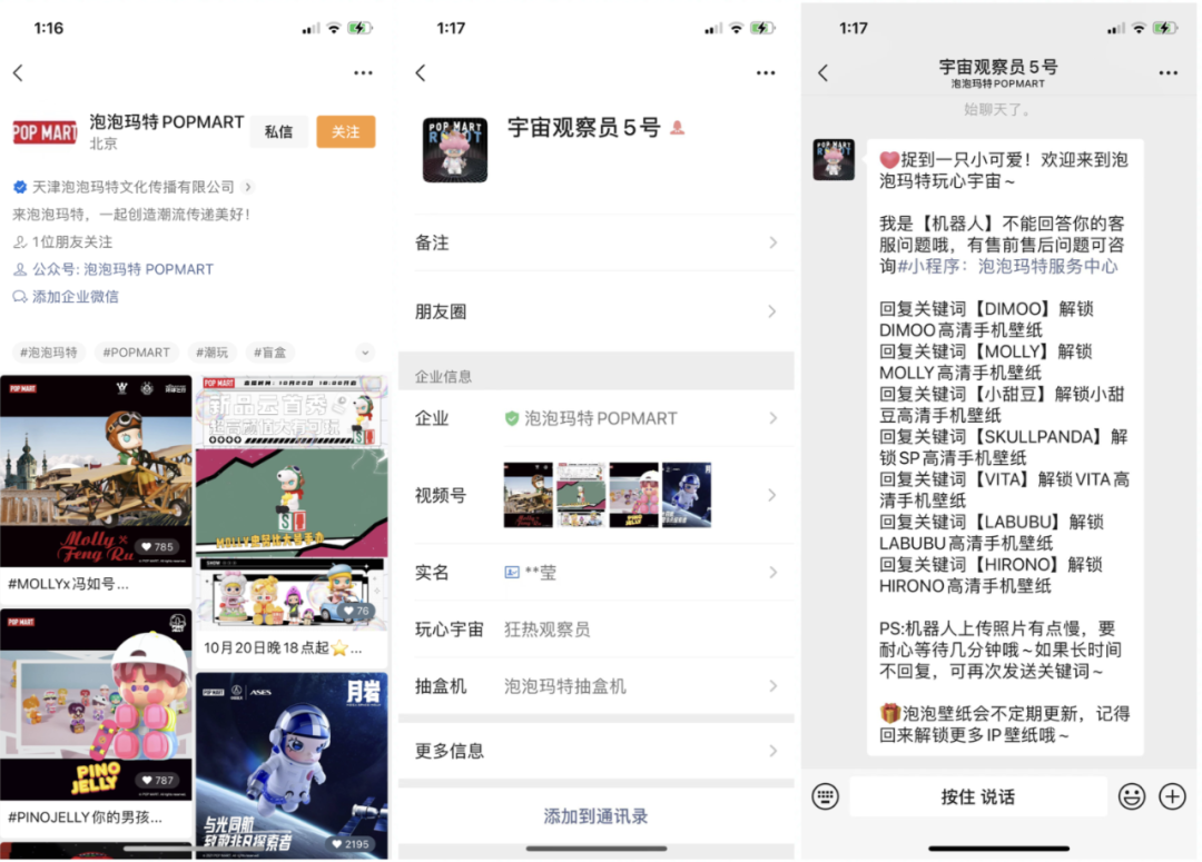 作为泡泡玛特在视频号的宣推阵地,资料简介里有关联公众号和企业微信,企业微信内又有关联抽盒机,这一系列的引流直接让你去买盒抽盒的路径真的很秀啊!