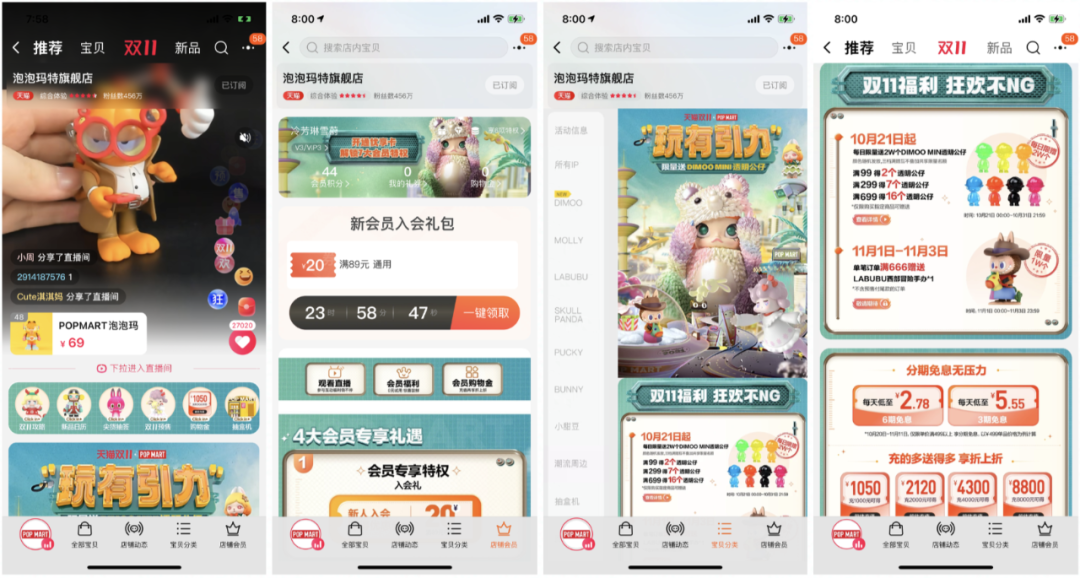 总结:泡泡玛特私域矩阵主要以天猫和微信平台为主,这在其财报中的各平台收入也能看出来其侧重点,其他平台更像是“刷个存在感,不能没有”的存在,此外抖音直播间更像是今年新的私域重点,双十一期间连续24h直播不间断,但后续运营程度如何还需追踪。值得一提的是,泡泡抽盒机作为「抽盒体验线上化」的产品,已逐步由微信小程序拓展到天猫和抖音平台。