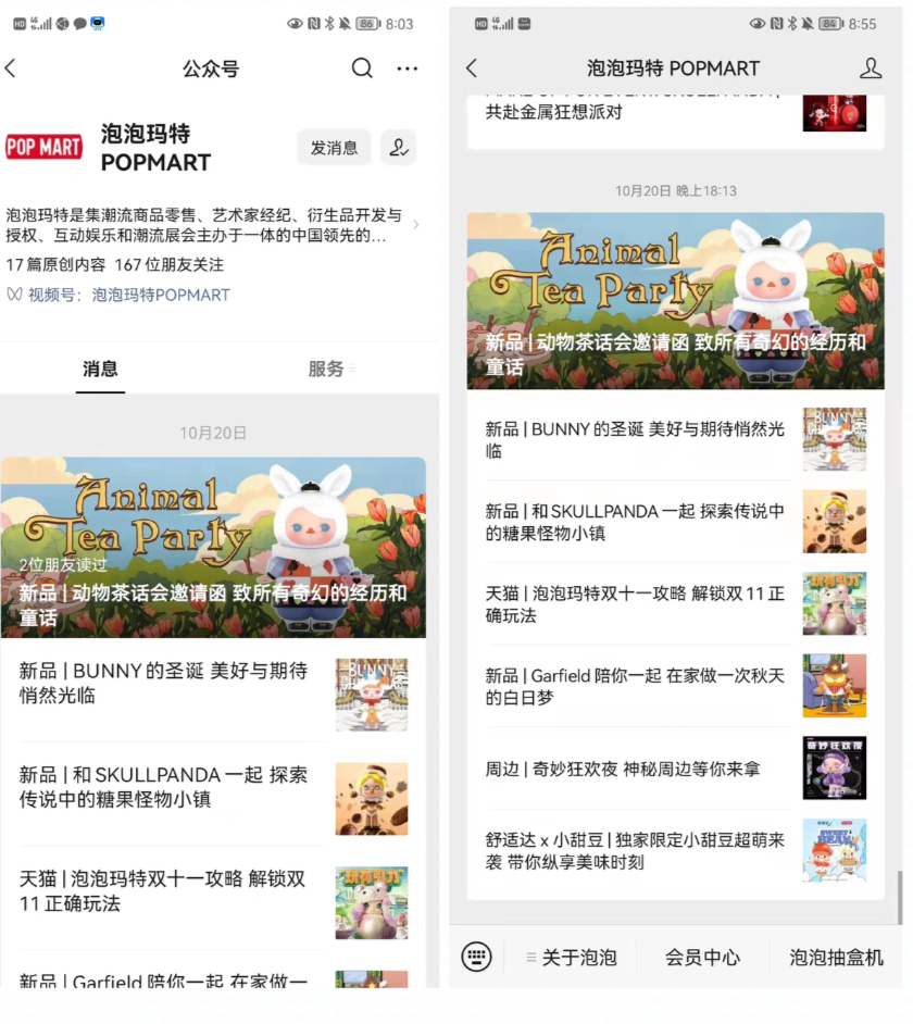泡泡玛特公众号:线下实体店会引流至公众号。公众号日常发布新品及各种活动,底部菜单栏可直达官方小程序和泡泡抽盒机。