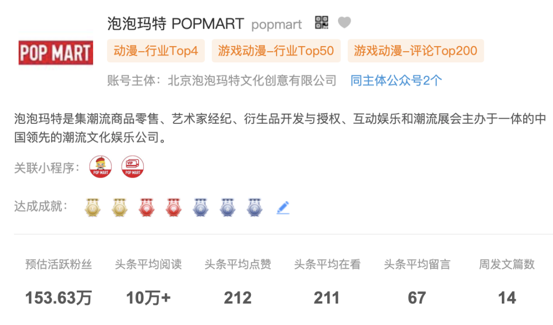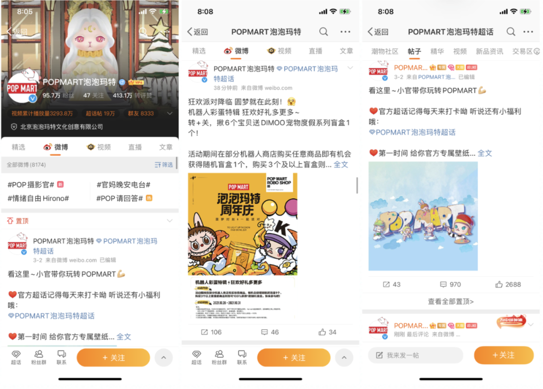 泡泡玛特微博账号的定位为品牌官宣,主要运营超话、新品预告、全网活动等内容。