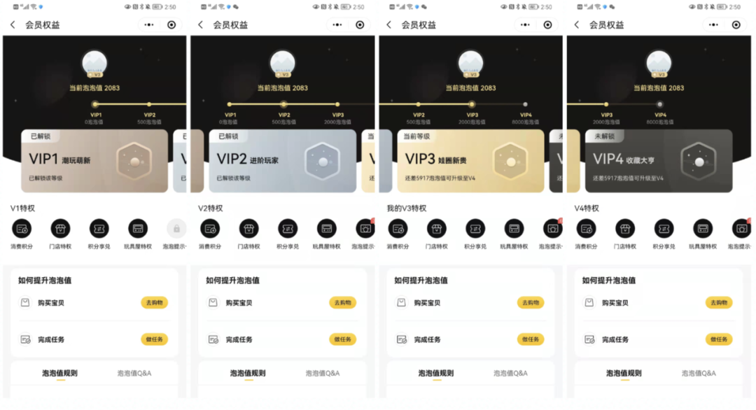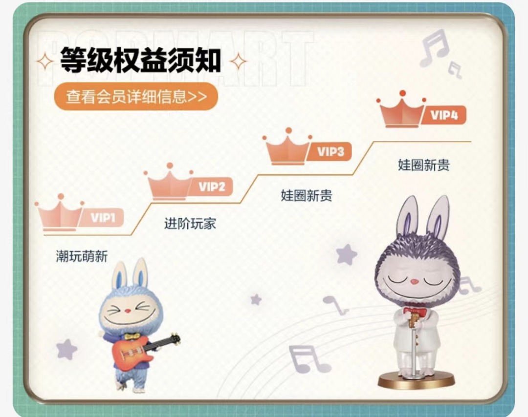 会员等级:潮玩萌新、进阶玩家、娃圈新贵、收藏大亨