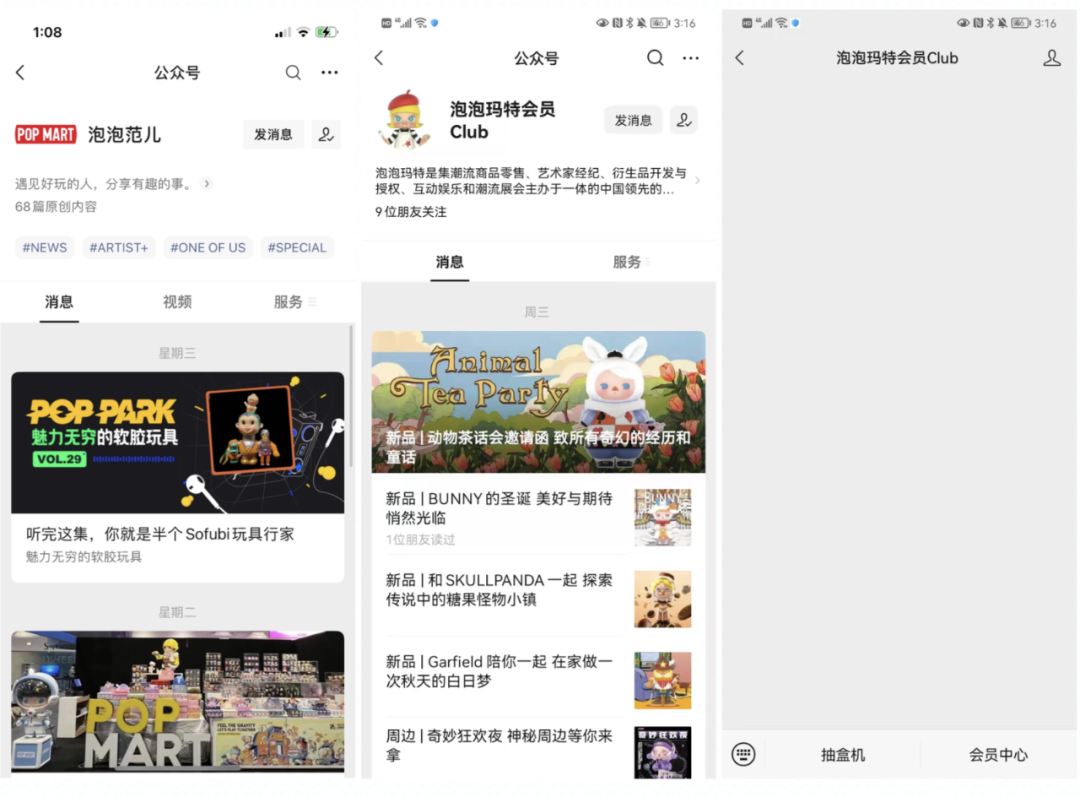 旗下一共有三个公众号:泡泡玛特POPMART、泡泡范儿泡泡玛特会员Club,泡泡玛特POPMART作为其官方公众号,承接所有的功能和主要内容传播;泡泡范儿作为非官方性质的公众号,主要为用户分享关于泡泡玛特的故事(相对来说关注的人也更少);泡泡玛特会员Club主要运营会员相关,菜单栏直达抽盒机与泡泡玛特会员中心。