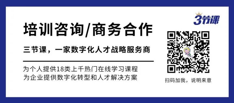 • 作为国内领先的数字化人才战略服务商,三节课以“链接全球优质课程资源,助力企业数字化转型和人才升级”为核心理念,是一家既有to C又有to B基因的公司。 • 面向个人,三节课以提升个人职业能力为目标,是陪伴300w互联网人职业成长的在线课堂。运营产品等18大品类数千门线上学习课程,7年来已得到数百万学员口碑验证。 • 面向企业,三节课提供以课程内容为核心的数字化人才在线解决方案,已服务包括世界500强、中国500强在内的众多行业头部公司,并获得业界一致认可与好评。