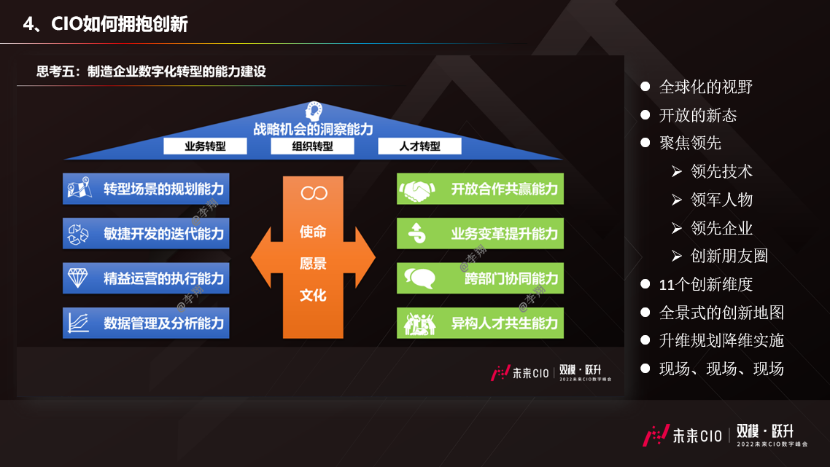 第四,形成全景式的创新地图。《制造企业创新路径——方法与案例》一书所提供的创新思考的 11 个维度,为在座的 CIO 们提供了一个思考的框架;